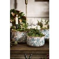 Including a small, medium and large size, this trio of ceramic planter bowls have a distressed, crackle glaze finish for a vintage look. Each plant pot boasts scalloped detail around the rim, and is painted with a chinoiserie inspired pattern of rich teal coloured leaves that provide a beautiful contrasting effect against the natural background. These round planters are ideal to display a variety of your favourite leafy ferns and plants around your home. Place them apart to give a room a flowing, cohesi...