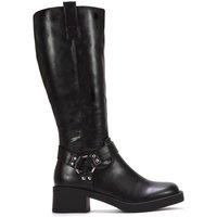 Knee high chunky western boots with zip, 4.8 CM block heel, and buckle detail. Perfect for everyday, going out, casual, parties, festivals. | XY London Women's 'Roma' Knee High Biker Mid Block Heel Western Boots in Black | Size: 8
