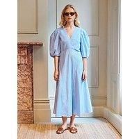Vivere Mila Full Sleeve Stripe Dress Size & Fit True to size - order your usual size Regular fit Midi length Available in sizes 8 - 16 Details Mila Full Sleeve Stripe Dress by Vivere Blue Half puffed sleeves V neck Back zip fastening Striped print Material & Care Material Content: 60% Polyester 40% Cotton Washing Instructions: Machine Washable