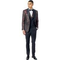 The Alino three piece tuxedo suit in red gold glitter print on maroon is the latest addition to the XPOSED London Party / Wedding Collection and features a black satin peak lapel with sateen trimmed flap pockets and kissing buttons on the sleeves. Our dress suit is versatile and can be worn to various formal occasions, such as weddings, proms, evening cruises, black-tie events, and beyond Complete the look with the matching black waistcoat featuring printed lapels and plain black trousers, making it a p...