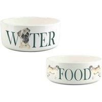 This set of white pet bowls are perfect for your Pug! With adorable dog drawings, and the word 'Food/Water' marked in bold text, this ceramic bowl set is just the thing for your pup's meal times. With one small food bowl and one large water bowl, all your dogs needs are covered. Features: Dishwasher safe Perfect as a gift or for everyday use Food Bowl - 500ml capacity, 15cm (dia) x 5.8cm (h), Water Bowl - 1 litre capacity, 18cm (dia) x 8cm (h) Specifications: Dimensions: H:7.0 x W:17.5 x D:17.5 cm Co... - Manufacturers part number: PBM10044-2