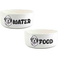 This set of white ceramic pet bowls each feature a fun, cartoon-style illustration of a Old English Sheepdog's face, an adorable addition to any kitchen! With one food bowl and one water bowl, all your dogs needs are covered. Features: Dishwasher safe Perfect as a gift or for everyday use 1 litre capacity, 17.5cm (dia) x 7.5cm (h) Specifications: Dimensions: H:15.0 x W:17.5 x D:17.5 cm Colour: White Guarantee:12 Months Material: Ceramic Model Number: 56977 - Manufacturers part number: PBL20174-2