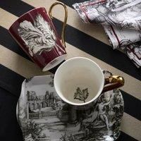 Enter a realm of opulence and extravagance with the exquisite Festivo mug and tray set by the revered Laurence Llewelyn-Bowen. Envision a world where each mug boasts a unique hand-drawn print against a resplendent burgundy backdrop, resonating with theatrical allure and maximalist charm. Complementing this, the classic hand-drawn toile design adorns the tray, harmonizing elegance and grandeur. Crafted from the finest porcelain, this set embodies luxury and sophistication, beckoning you to savor moments of refined indulgence in your stately abode. | Laurence Llewelyn-Bowen 'Festivo' Porcelain 2 Mug & Tray Set - Manufacturers part numbers: JRBMTSLLFESTIVOMULTI|Laurence Llewelyn-Bowen_5056734225498
