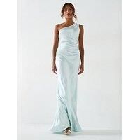 Six Stories Satin One Shoulder Ruched Bridesmaid Dress - Ice Blue Size & Fit True to size - order your usual size Regular fit Maxi length Available in sizes 8 - 18 Details Satin One Shoulder Gathered Bridesmaid Dress - Ice Blue by Six Stories Blue One shoulder wide strap Ruched side gathering Concealed side zip Luxurious smooth satin feel with a soft sheen finish