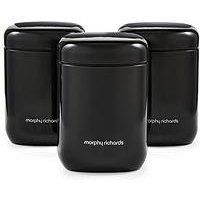 Organise your kitchen today using our stylish Storage Canisters Set, designed from durable carbon steel and finished with a sleek powder coating. Our canisters are designed with secure lids, ideal for keeping your coffee, sugar, tea, and other dry foods fresh. Designed with an easy to clean surface, simply wipe down with a damp cotton cloth, making cleanup a breeze. This set is the perfect solution for a mess free and beautifully organised kitchen. Plus, these storage canisters match our Equip Kettle & Toaster Range! Looking for a taller set to store spaghetti£ Check out our Large Storage Canisters Set. | Morphy Richards Storage Canisters Set in Black | Size: Small - Manufacturers part numbers: 830001|Morphy Richards_5056765401380
