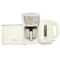 The Morphy Richards Equip Breakfast Set is a stylish and practical trio that includes a 1.2L Filter Coffee Machine, a 1.7L Jug Kettle, and a 2 Slice Toaster perfect for kickstarting your mornings with ease. The coffee machine features pour-over technology for a rich, full-bodied brew, a reusable permanent filter, and a keep-warm function to maintain your coffees temperature. The 1.7L kettle offers rapid boiling with a 3kW element, a removable limescale filter, and a 360 swivel base for convenience. The 2 slice toaster comes with variable browning control, wide slots for thicker breads, and a removable crumb tray for easy cleaning. With a sleek black and stainless steel finish, this set is ideal for students heading to university or anyone moving into a new home, combining essential functionality with modern design to suit any kitchen. | Morphy Richards Equip Kettle, Toaster & Coffee Machine Breakfast Set in Cream - Manufacturers part number: Morphy Richards_5056765430816
