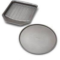 Introducing our 14" pizza pan. Made from a heavy duty carbon steel, this pan is built to last and ensures your pizza will come out perfectly crispy and delicious every time. Plus, it is dishwasher safe for quick clean-up! Elevate your cooking game with our crisper tray, this will soon become your favorite kitchen companion. Featured with a perforated base, you will get perfectly crispy chips, succulent chicken as it is designed to circulate air ensuring an even heat distribution throughout the cooking process. Our non-stick tray can withstand temperatures up to 230 degrees and is featured with a pouring lip allowing for easy serving. | Morphy Richards Pizza Pan & Crisper Tray Set in Grey - Manufacturers part numbers: 843751, 841501|Morphy Richards_5056765489999