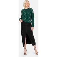 This green jumper ticks all the boxes with its mixed knit pattern and pearl embellishment over the dropped shoulders and front bodice.