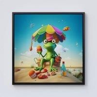 You can enhance any art decor by Warrens pieces because they are vibrant, stylish and full of life. Canvases come in a variety of sizes, making it possible to customize the size to fit any wall in the house perfectly. The canvas is hand stretched over a solid wooden frame, and then encased in a stylish frame with a enamel finish, we have a choice of Black, White or Pine frames. | Warren Reed - Designer Frog On A Beach Holiday Framed Canvas in Black | Size: w40 inch x h40 inch