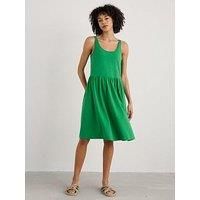 Seasalt Cornwall Sun Splendour Dress Size & Fit True to size - order your usual size Regular fit Knee length Available in sizes 8 - 24 Model is 5'10 / 178cm and wears a size UK 8 Details Sun Splendour Dress by Seasalt Cornwall Green Cool and soft cotton fabric with a touch of added stretch Gathered fabric at the waist Scoop neck Sleeveless Machine Wash 30C Material & Care Material Content: 96% Cotton (organic), 4% Elastane Washing Instructions: Machine Washable