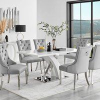 Our Leonardo 4-seat dining table has a stunning white glass marble effect top and shiny chrome silver legs in a stylish nested starburst design. We're excited to bring you this update to our popular Leonardo range! Combining minimalist design with classy modern style, the Leonardo glass marble table will transform your dining room. The white marble-effect glass tabletop has a grey veining pattern and, when paired with the reflective chrome legs, creates a bright and spacious feel for your dining space and adds light. This rectangular dining table is made from strong tempered glass with a white marble effect and has a flat edge. It's sat on top of sturdy silver chromed legs, so it's not only designed to last but to look great while doing it! Available in a larger 6-seat size and a range of other colours/materials, so check out the full Leonardo dining set range for more ideas. Note: The marbling effect is a bespoke and unique pattern each time, to reflect the one-of-a-kind patterns of n... - Manufacturers part number: FurnitureboxUK_5056784301128