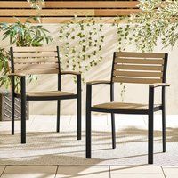 Our Malva 2 seat outdoor chairs will certainly makes an impact. A gorgeous combination of materials and colours with a sleek contemporary design means this set will suit a range of styles from modern industrial to more traditional spaces. Add this pair of garden chairs balcony, patio or deck, or combine them with our Malva outdoor dining sets. The chairs are constructed from a sturdy black powder coated aluminium frame with solid eucalyptus wood panels. The wood is responsibly sourced eucalyptus wood with a light teak colour stain. The chairs are stackable, for easy storage, and are UV and weather resistant so shouldn't fade. Check out our full outdoor furniture range today to complete your dream garden space! Comes fully assembled. This product comes with a 1-year warranty. | FurnitureboxUK Malva 2 x Solid Wood Outdoor Dining Chairs in Black - Manufacturers part number: FurnitureboxUK_5056784304877