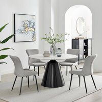 Our stunning Nina table is marble effect round dining table with a large statement stainless steel central pillar leg in gunmetal grey. A sleek, elegant design that combines simple curves and straight lines. The white marble-effect top has a matte finish, and the metal pedestal table leg has a glossy gunmetal grey chromed finish. This will make a real statement, whether you're going for an industrial dining room or something more minimalist. Comfortably sits 4 - 6, this table is built to last and look fab while doing it. Please note that due to the construction process for the ceramic table top, there may be markings on the underside of the table. The gunmetal grey leg may look lighter or darker depending on the light. The Nora chair is a super-stylish modern chair with a nod to the classic wingback design. The elegant vertical piping stitching to the back and ergonomically designed seat sat on 4 slightly tapered legs make this uncluttered, classy and comfortable. The light grey velvet... - Manufacturers part number: FurnitureboxUK_5056784309919