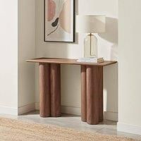 Our Sutton walnut veneer wood console table will be a stylish addition to any living room. This rectangular occasional table has a sleek dark brown walnut wood veneer finish that gives it a modern, sleek look. The simple table top sits on 2 sets of triple pillar legs, a versatile design that fits well with different interior styles, from contemporary to industrial or Scandi. Constructed from sturdy wood composite with a walnut wood veneer, the Sutton is built to last. This console table is not only stylish but also practical, offering extra surface space for lamps, keepsakes and decorative items. Pair it with a matching coffee table and side table from the Sutton range to create a cohesive look in your living room. | FurnitureboxUK Sutton Walnut Veneer Wood Console Table - Manufacturers part number: FurnitureboxUK_5056784311189