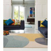 Our Retro blue and yellow arches rug is a gorgeous modern rug featuring a neutral beige background and a simple pattern of overlapping light blue, dark blue and yellow arches in solid blocks and stripes. Great for lounge areas, bedrooms or dining rooms. An eye-catching design that will work well in both bold and eclectic spaces and to add colour to more minimalist rooms. The colour combo gives this rug a bit of a retro vibe that could work really well in a wood and Scandi inspired space. Made from 100% Polypropylene that won't fade, on a jute back with a 12mm pile that's easy to keep clean. Note: Due to differences in how screens display colours, there may be some slight variations in colour from what is pictured. | FurnitureboxUK Retro Blue & Yellow Arches Rug | Size: 120cm x 170cm - Manufacturers part number: FurnitureboxUK_5056784311974