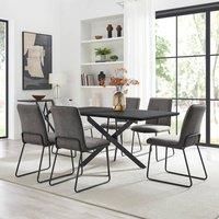 Our Leonardo 6 seat black dining table will make a striking centrepiece for your dining room or kitchen with its matte black table top and matching black metal legs. The elegant legs are arranged in a stylish nested starburst design. A black table for 6 that ticks off those modern, minimalist design boxes with some Industrial flair, the Leonardo will create a sleek look for your home. This rectangular dining table is constructed from sturdy wood composite with a durable black veneer that has a wood grain effect to it. It's sat on top of sturdy black powder coated legs, so it's not only designed to last but to look great while doing it! The Halley chair is a super-stylish design with nods to postmodern mid-century classic elements. The clean lines of the deep-padded seat and on-trend industrial metal legs connected front and back with open diamond spaces will keep your dining or living room looking chic and classy. The soft fabric of these dining chairs will add warm tones to your dinin... - Manufacturers part number: FurnitureboxUK_5056784313251