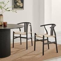 Our 2x Caia black wood dining chairs will add some timeless Scandi-inspired style to your dining room. This elegant pair features clean lines, a sculptural shape, and the distinctive Y-shaped backrest associated with the Wishbone chair style. The rounded armrests flow seamlessly into the chair back. Perfect for modern, minimalist, or boho interiors, these chairs combine understated sophistication with everyday functionality. Crafted from solid beech wood with a sleek black stained finish, each chair boasts a woven paper rope cord seat for comfort and durability. Non-slip black foot protectors keep your floors safe, while the fully assembled design means no fuss, just unbox and enjoy. This pair of wooden dining chairs blend elegance and practicality, making them a standout choice for any dining space. The wood used is sustainably sourced. | FurnitureboxUK 2x Caia Black Wood & Rope Wishbone Dining Chairs - Manufacturers part number: FurnitureboxUK_5056784313633