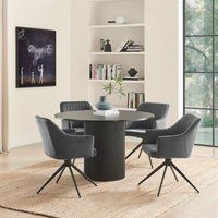 Our Penrose black round wooden pedestal dining table is a simple yet elegant table for your dining room. 120cm in diameter, meaning it will comfortably seat 4. Featuring a single slatted wood pillar leg, the Penrose is all about clean lines and simple shapes, drawing inspiration from Scandi and Japanese interior design. Perfect for family dinners and for entertaining guests. Constructed from sturdy and durable wood composite with a matte black scratch-resistant melamine veneer finish that has a wood grain effect, and a black painted edge. The Penrose dining table will look fab in any modern home with its sleek minimalist look. Matching side and coffee tables available, also in an oak effect. Our Calla faux leather swivel dining chairs with black legs will be the perfect addition to your kitchen or dining room. Stylish yet practical, swivel chairs are great for narrower spaces as you don't need to push them back from a table to stand up. This sleek industrial and minimalist look will su... - Manufacturers part number: FurnitureboxUK_5056784315897