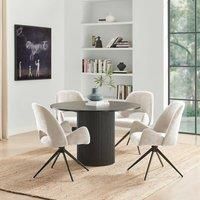 Our Penrose black round wooden pedestal dining table is a simple yet elegant table for your dining room. 120cm in diameter, meaning it will comfortably seat 4. Featuring a single slatted wood pillar leg, the Penrose is all about clean lines and simple shapes, drawing inspiration from Scandi and Japanese interior design. Perfect for family dinners and for entertaining guests. Constructed from sturdy and durable wood composite with a matte black scratch-resistant melamine veneer finish that has a wood grain effect, and a black painted edge. The Penrose dining table will look fab in any modern home with its sleek minimalist look. Matching side and coffee tables available, also in an oak effect. Our Layla fabric swivel dining chairs with black legs will be the perfect addition to your kitchen or dining room. Stylish yet practical, swivel chairs are great for narrower spaces as you don't need to push them back from a table to stand up. A curvy chair, featuring a rounded back and cut out hol... - Manufacturers part number: FurnitureboxUK_5056784315941