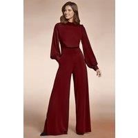 This wide leg jumpsuit is a HotSquash London cult classic! Designed in a soft-touch jersey fabric with palazzo pants style legs, contrasted with a crepe blouson sleeved top, this jumpsuit is the epitome of sophistication. With a wide waistband to sinch you in further and give off that classic hourglass figure. This jumpsuit can be dressed up or down and truly works for every occasion! This style is secured at the back with an invisible zip at the back and buttons behind the neck. | Hot Squash Women's Wideleg Jumpsuit with Blouson Sleeve in Wine | Size: 12 - Manufacturers part number: Hot Squash_5056790309781