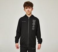 Mercier Junior Badge 2.0 Woven Hoodie in Black. Weaving an immediate opening into your day-to-day casual wardrobe, the gap is ably filled by this bona fide woven layering legend that arrives from Mercier. With a full zip fastening front, fixed hood, elasticated cuffs and hem, handy side pockets and Mercier branding to front including a series of signature repeat logos to left chest. Standard fit. Black Size - S/B