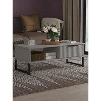 SWIFT Fara Ready Assembled 1 Drawer Coffee Table This modern coffee table, has a single storage drawer and open shelf stroage area. A new stand out range, with its new deep cut "fluted" grove patten of the drawer and door fronts. Featuring black metal handles and black sleigh legs. A striking and individual range that is perfect for the modern home. All our furniture is made to order in the United Kingdom, to the highest quality. It is delivered within 10 working days direct to your location of choice...