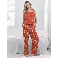 Chelsea Peers Tie Strap Button Down Cami With Tie Split Straight Leg Trousers - Orange Drift off into autumnal slumbers with this dusky, burnt orange pyjama set, printed with hand-drawn illustrations of sleepy foxes curled up in crescent moons. In tactile, breathable cotton cheesecloth, a tie shoulder babydoll inspired cami top is paired with long pyjama trousers, complete with pockets, a drawstring waist, and subtle side splits for easy, dreamy lounging.