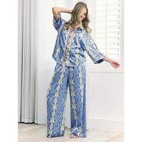 Chelsea Peers Long Button Up Set With 3/4 Length Sleeve In Moon Stripe Print In Satin Slip into something celestial with these luxurious satin pyjamas, adorned with an enchanting hand-drawn tile motif of vintage inspired moons and stars on a background of wavy blue skies. The 3/4 length sleeve button-up shirt pairs perfectly with flowing, wide-leg bottoms in a relaxed, oversized fit for effortlessly elevated lounging.