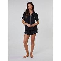 Loungeable Rib Short Sleeve Traditional Shirt And Shorts Set Size & Fit True to size - order your usual size Relaxed fit Available in sizes XS - XL Details Rib Short Sleeve Traditional Shirt And Shorts Set by Loungeable Black Short sleeved shirt Revere collar Button front fastening Chest pocket Elasticated waist shorts Material & Care Material Content: 60% polyester ,33%viscose ,7% elastane Washing Instructions: Machine Washable