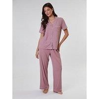 Loungeable Rib Short Sleeve Shirt And Long Trouser Set Size & Fit True to size - order your usual size Relaxed fit Available in sizes XS - XL Details Rib Short Sleeve Shirt And Long Trouser Pyjama Set by Loungeable Pink Short sleeved shirt Revere collar Button front fastening Chest pocket Straight trouser Elasticated waist detail Ribbed fabric Ribbed fabric Material & Care Material Content: 60% polyester ,33%viscose ,7% elastane Washing Instructions: Machine Washable