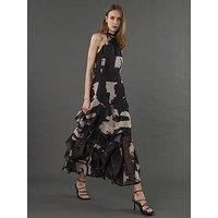 Religion Taylor Maxi Dress With Full Frill Skirt The Taylor maxi dress is a stunning occasion piece featuring a halterneck design with a fitted bodice and a dramatic, long A-line skirt adorned with delicate frills. The dress showcases our bold, abstract Facade print in black and soft ashes of roses. Its sleeveless style enhances its flowy, ethereal feel, making it perfect for special occasions. Length from the top: 140 cm. The model wears a size 10. Washing Instructions: Machine Washable - Manufacturers part number: WG2WW