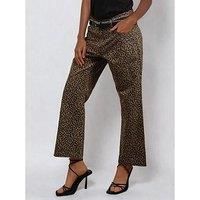 Religion Maeva Leopard Print Trousers - Beige Add an edge to your outfit with the Maeva trousers in mixed leopard print in camel and brown tones. These regular fit trousers feature front and back pockets, fly zip and button fastening, belt loops, and a flare ankle length fit. Wear with trainers and a jumper or heels and a blazer or go for the full look with the matching shirt. The model wears a size 1. Inseam length: 69 cm Material Content: 100% Cotton Washing Instructions: Hand Wash Only