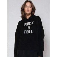 Religion Rock N Roll Slogan Courtney Soft Yarn Hoody Jumper - Black The Courtney Hoodie is this season must have knitwear piece, cosy yet stylish and made from a soft wool mix knit. Featuring a hood and simple Rock and Roll slogan jacquard in black and white, this oversized knitted hoodie offers long sleeves and a hip-length fit. Easy to wear and perfect for layering under a jacket. It's ideal for pairing with our Ida leather leggings or wide leg trouser for a contemporary, fashionable look. The model ...