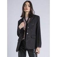 Religion Emily Collarless Foil Tie Blazer - Black The Emily Jacket is a versatile and stylish addition to any wardrobe. This collarless blazer features a sleek button closure and a relaxed tailored fit, offering both comfort and elegance. Designed with slim sleeves and a hip-length cut, it strikes the perfect balance between casual and polished. Crafted in a black tailoring fabric with a silver sparkle, it comes with a detachable loose tie that can be styled around the neck for a chic tie look or worn a...