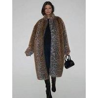 Religion Dolly Faux Fur Leopard Animal Print Coat - Animal The Bold Dolly Fur Coat is a statement style in a textured faux animal finish, designed to feel as soft as it looks. With long sleeves, a classic collar and lapel, and a midi-length oversized fit, it's both warm and stylish. Wear over leather leggings or dress it up with a party dress. Finished with hook-and-eye closures, side pockets, and an inside pocket for extra ease-this is your go-to for bold, cold-weather dressing. The model wears a size...