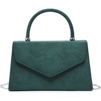Suede Clutch Bag with top handle, magnetic button clasp, Internal slip pocket For Card Storage and detachable metal chain. Size:20 X 6 X 13 cm; Handle Drop:8 cm. | JFY Women's Top Handle Suede Clutch Bag in Dark Green - Manufacturers part number: JFY_5056821405253