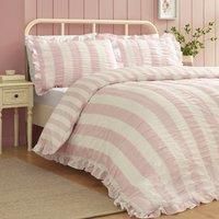 Effortlessly fresh and full of charm, this bedlinen features classic stripes on a textured seersucker base for a light and airy feel. Beautifully complemented by frill detailing, this design strikes the perfect balance between sweet and sophisticated. Perfect for creating a relaxed yet stylish space with subtle texture and timeless appeal. Created from easy-care polyester and soft cotton, blended for everyday use. Catherine Lansfield is renowned for style and quality - designed and developed in Great Britain. Made to quality and human-ecological safety standards, in accordance with STANDARD 100 by OEKO-TEX. | Catherine Lansfield 'Seersucker Frill Stripe' Duvet Cover Set in Pink | Size: Super King - Manufacturers part numbers: TRBBDSCLSSKRFRILLSTPPINK0117|31035044