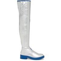 SnowMikus stage presence deserved a boot that looks born from winter light, but moves like second skin. We started with a stretchy silver faux leather that catches every spotlight like brushed chrome. The Miku teal outsole signals the reference before youve even taken the first step. | KOI Women's The SNOW MIKU Long Boots - Silver | Size: 7