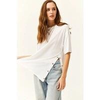 Crafted from 100% pure cotton, this T-shirt offers exceptional breathability and comfort. Its unique side button detailing adds a refined touch to a classic silhouette, allowing for easy adjustments and a tailored fit. Durable and soft, the fabric ensures long-lasting wear, making it a versatile staple for any expert wardrobe. CARE INSTRUCTIONS: Check the care label for instructions. Pre-treat stains before washing. Machine wash on a gentle cycle with cold water. Use a mild detergent suitable for delicate fabrics. Avoid bleach and fabric softeners. Air dry or use a low heat setting in the dryer. Iron on a low-temperature setting if needed. Store in a cool, dry place away from sunlight. COLOR DISCLAIMER: Your screen brightness, contrast, and saturation settings will affect the image viewed on your screen. | HOXTON GAL Women's Regular Fit 100% Cotton T-Shirt with Side Buttons in White | Size: Medium