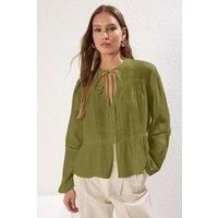 This regular fit blouse combines textured cotton fabric with delicate lace detailing on the sleeves, delivering a sophisticated and breathable garment. Its structured yet comfortable design makes it an excellent choice for both professional and casual settings, blending classic elegance with modern craftsmanship. CARE INSTRUCTIONS: Check the care label for instructions. Pre-treat stains before washing. Machine wash on a gentle cycle with cold water. Use a mild detergent suitable for delicate fabrics. Avoid bleach and fabric softeners. Air dry or use a low heat setting in the dryer. Iron on a low-temperature setting if needed. Store in a cool, dry place away from sunlight. COLOR DISCLAIMER: Your screen brightness, contrast, and saturation settings will affect the image viewed on your screen. | HOXTON GAL Women's Regular Fit Lace Sleeve Detail Textured Cotton Blouse in Khaki | Size: 8