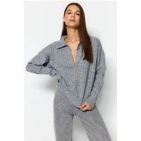 Embrace understated luxury with this soft-textured vizon polo neck knit sweater. Crafted for comfort and style, its oversize fit offers relaxed sophistication while the polo neck provides warmth and a refined silhouette. Ideal for layering or wearing alone, this versatile knit enhances your wardrobe with timeless elegance and tactile softness.. CARE INSTRUCTIONS: Check the care label for instructions. Pre-treat stains before washing. Machine wash on a gentle cycle with cold water. Use a mild detergent suitable for delicate fabrics. Avoid bleach and fabric softeners. Air dry or use a low heat setting in the dryer. Iron on a low-temperature setting if needed. Store in a cool, dry place away from sunlight. COLOR DISCLAIMER: Your screen brightness, contrast, and saturation settings will affect the image viewed on your screen. | HOXTON GAL Women's Relaxed Fit V-Neck Ribbed Knit Long Sleeve Polo Cardigan Collar Sweater Jumper in Grey | Size: Small