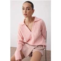 Embrace understated luxury with this soft-textured vizon polo neck knit sweater. Crafted for comfort and style, its oversize fit offers relaxed sophistication while the polo neck provides warmth and a refined silhouette. Ideal for layering or wearing alone, this versatile knit enhances your wardrobe with timeless elegance and tactile softness.. CARE INSTRUCTIONS: Check the care label for instructions. Pre-treat stains before washing. Machine wash on a gentle cycle with cold water. Use a mild detergent suitable for delicate fabrics. Avoid bleach and fabric softeners. Air dry or use a low heat setting in the dryer. Iron on a low-temperature setting if needed. Store in a cool, dry place away from sunlight. COLOR DISCLAIMER: Your screen brightness, contrast, and saturation settings will affect the image viewed on your screen. | HOXTON GAL Women's Relaxed Fit V-Neck Ribbed Knit Long Sleeve Polo Cardigan Collar Sweater Jumper in Light Pink | Size: Medium