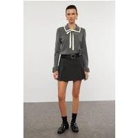 This color-block knit sweater features a refined ribbon bow detail, combining classic knitwear with a subtle decorative touch. Crafted for regular fit comfort, it offers both style and ease, making it a versatile addition to any expert wardrobe. The contrasting color blocks enhance its modern appeal while maintaining a timeless silhouette. | HOXTON GAL Women's Knit Sweater with Contrast Collar & Front Ribbon Bow Tie Detail in Dark Grey | Size: Small