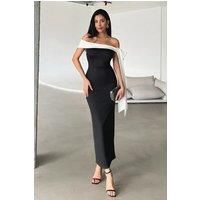 This elegant fitted knit evening dress offers a sleek silhouette tailored from luxurious stretch fabric for a comfortable and flattering fit. The sophisticated shoulder bow detail adds a polished and contemporary accent, making it ideal for refined evening affairs where understated elegance is key. CARE INSTRUCTIONS: Check the care label for instructions. Pre-treat stains before washing. Machine wash on a gentle cycle with cold water. Use a mild detergent suitable for delicate fabrics. Avoid bleach and fabric softeners. Air dry or use a low heat setting in the dryer. Iron on a low-temperature setting if needed. Store in a cool, dry place away from sunlight. COLOR DISCLAIMER: Your screen brightness, contrast, and saturation settings will affect the image viewed on your screen. | HOXTON GAL Women's Elegant Off-Shoulder Fitted Knit Maxi Dress with Shoulder Bow Detail in Black | Size: 14
