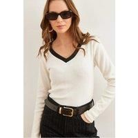 Elevate your wardrobe with this slim-fit blouse crafted from soft cotton knit fabric featuring a brushed finish for added warmth and comfort. The stretch material moves with you, ensuring a flattering silhouette, while the elegant neck detail adds a refined touch to any ensemble. Perfect for sophisticated day-to-night styling. CARE INSTRUCTIONS: Check the care label for instructions. Pre-treat stains before washing. Machine wash on a gentle cycle with cold water. Use a mild detergent suitable for delicate fabrics. Avoid bleach and fabric softeners. Air dry or use a low heat setting in the dryer. Iron on a low-temperature setting if needed. Store in a cool, dry place away from sunlight. COLOR DISCLAIMER: Your screen brightness, contrast, and saturation settings will affect the image viewed on your screen. | HOXTON GAL Women's V-Neck Ribbed Stretch Blouse with Contrast Neck Detail in Ecru | Size: Small/Medium