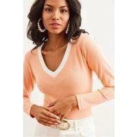 Elevate your wardrobe with this slim-fit blouse crafted from soft cotton knit fabric featuring a brushed finish for added warmth and comfort. The stretch material moves with you, ensuring a flattering silhouette, while the elegant neck detail adds a refined touch to any ensemble. Perfect for sophisticated day-to-night styling. CARE INSTRUCTIONS: Check the care label for instructions. Pre-treat stains before washing. Machine wash on a gentle cycle with cold water. Use a mild detergent suitable for delicate fabrics. Avoid bleach and fabric softeners. Air dry or use a low heat setting in the dryer. Iron on a low-temperature setting if needed. Store in a cool, dry place away from sunlight. COLOR DISCLAIMER: Your screen brightness, contrast, and saturation settings will affect the image viewed on your screen. | HOXTON GAL Women's V-Neck Ribbed Stretch Blouse with Contrast Neck Detail in Peach | Size: Large/XL