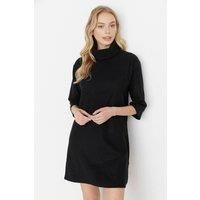 This turtleneck knit mini dress offers a sophisticated yet effortless look for the cooler seasons. Crafted from a soft stretch-knit blend, it provides both warmth and flexibility while maintaining a sleek, minimal silhouette. The high neckline and relaxed fit bring a refined touch, while the mid-length sleeves enhance comfort and versatility. Perfect for smart-casual styling, this piece transitions seamlessly from office wear to evening outings when paired with boots or heeled ankle shoes. CARE INSTRUCT...
