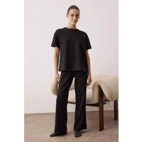 This 2-piece pajama set features a short-sleeve waffle-textured top paired with matching wide-leg trousers featuring a waist tie detail. Crafted from a soft knit blend, the set offers lightweight warmth, breathability, and a comfortable stretch. The waffle texture adds subtle depth and a modern tactile finish, while the drawstring waist provides an adjustable and flexible fit. Perfect for lounging or cozy evenings at home, this coordinated ensemble blends effortless style, comfort, and timeless simplici...