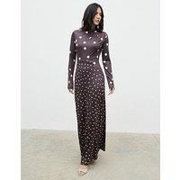 Pretty Lavish Delilah Asymmetric Polka Dot Maxi Jersey Dress - Brown Size & Fit True to size - order your usual size Regular fit Maxi length Available in sizes 6 - 16 Details Delilah Asymmetric Striped Maxi Jersey Dress by Pretty Lavish Brown Long sleeves Spot print High neckline Ruched shoulder detail Asymmetric seam detail Material Content: 95% Polyester 5% Elastane