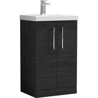 This floor-standing vanity unit features a bold charcoal black finish, smooth soft-close doors, and a premium mid-edge vitreous china basin. Space-saving and easy to clean, it provides practical storage while enhancing modern bathroom aesthetics. | Balterley Modern Bathroom 2 Door Vanity Unit Basin, Charcoal Black, 500mm in Black - Manufacturers part number: BFLE601A